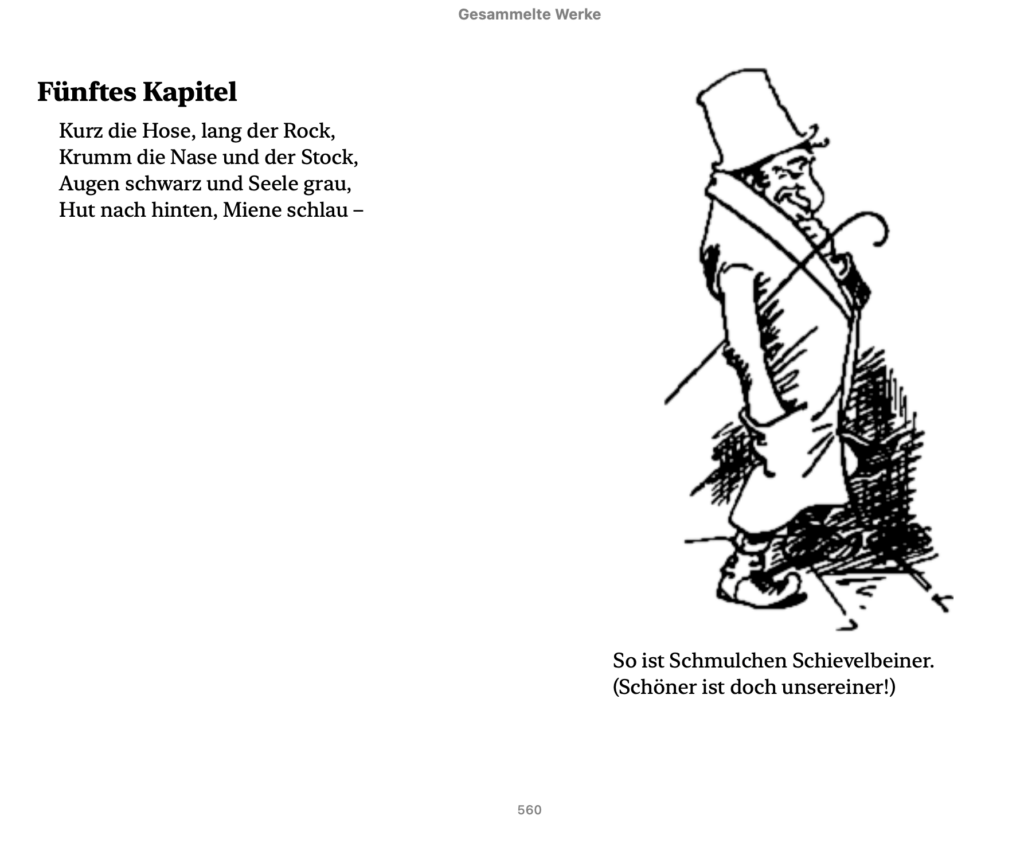 Im Wikipedia-Artikel zu Wilhelm Busch kann man alle möglichen Erklärungen dafür finden, warum das ganz normal gewesen sei. Es seien ja auch nur wenige antisemitische Passagen gewesen. Ich denke, was Buschs Antisemitismus angeht, gibt es kein Vertun, denn auch in Die fromme Helene gibt es eine eindeutige Passage: