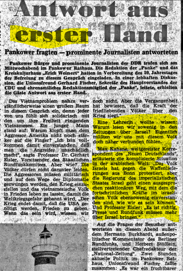 Für Menschen ohne DDR-Verständnis: Für das Statement der jüdischen Bürger der DDR gab es vielleicht einen Druck zum Unterschreiben von offizieller Seite. Anders war das für das obige Dokument: Max Kahane war die offizielle Seite (aus erster Hand). Was gedruckt wurde, war abgewogen. Auch wenn der Artikel das suggeriert, wurden keine spontanen Antworten, die vielleicht Minuten später bereut wurden, dokumentiert. Die Presse war in der Hand des Staates. Die CDU war eine gleichgeschaltete Blockpartei (Ulbricht Mai, 1945: „Es muss demokratisch aussehen, aber wir müssen alles in der Hand haben.“, Leonhard, 1955). Was Max Kahane hat drucken lassen, war seine Meinung und die des Staates und der Tenor dieser kurzen Meldung ist der gleiche wie der des Briefes der jüdischen Bürger*innen: Israel ist ein imperialistischer Agressor. Antisemitisch? Hängt von der Definition und deren Anwendung ab. Siehe oben. Antiimperialistisch? Ganz sicher. Bei Professor Eisler handelte es sich wohl um Hanns Eisler, ebenfalls ein Jude.